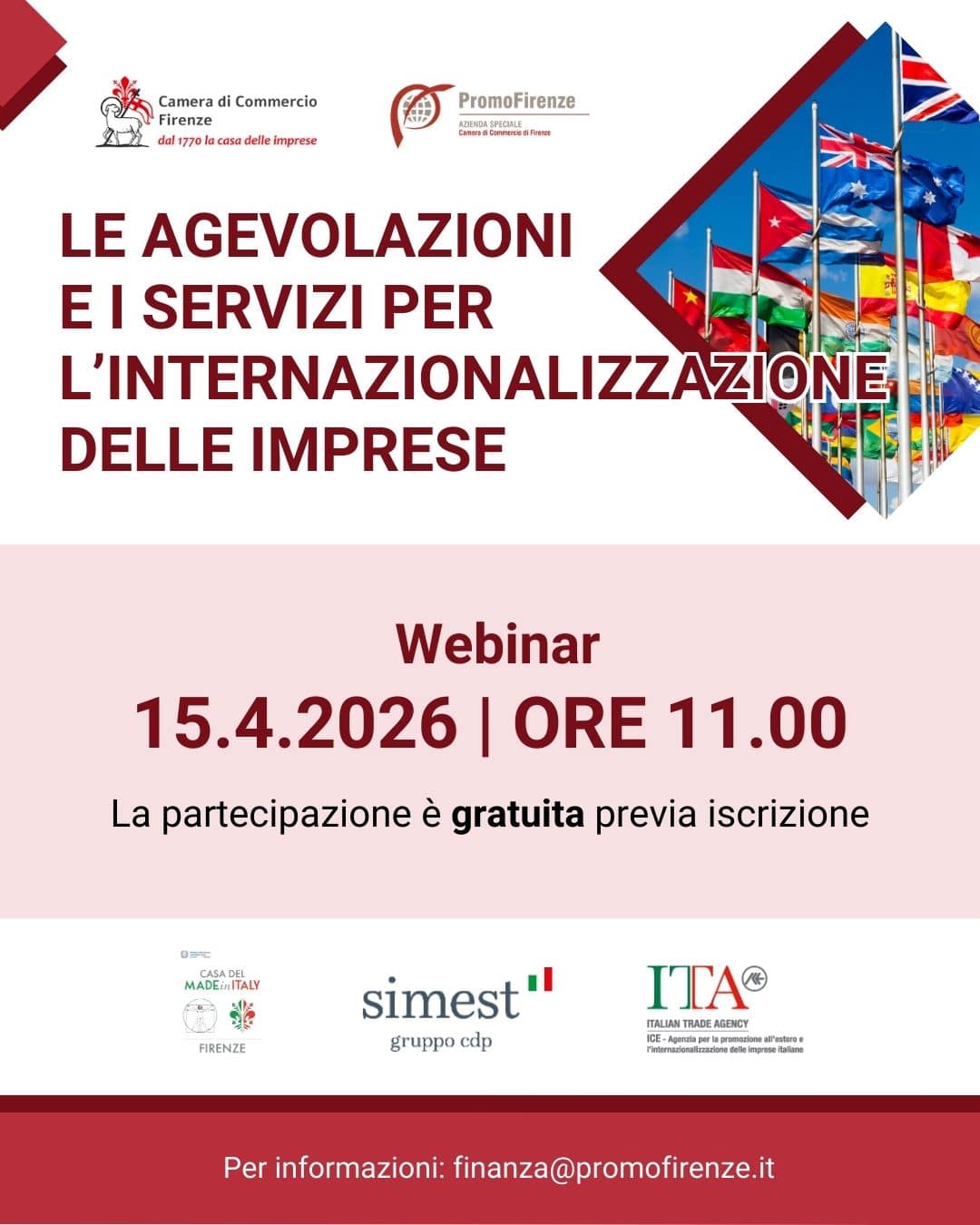 15 Aprile @ 11:00 - 13:00 WEBINAR – Gli strumenti a supporto dell’internazionalizzazione delle imprese Webinar online La Camera di Commercio di Firenze e la sua Azienda Speciale PromoFirenze, con la partecipazione della Casa del Made in Italy di Firenze/MIMIT-Ministero delle Imprese e del Made in Italy, SIMEST-Società Italiana per le Imprese all’Estero e di ICE-Agenzia per la promozione all’estero e l’internazionalizzazione delle imprese italiane, organizzano per mercoledì 15 aprile 2026 alle ore 11, un webinar tecnico rivolto alle imprese che intendono avviare, consolidare o riposizionare la loro presenza commerciale sui principali mercati esteri.