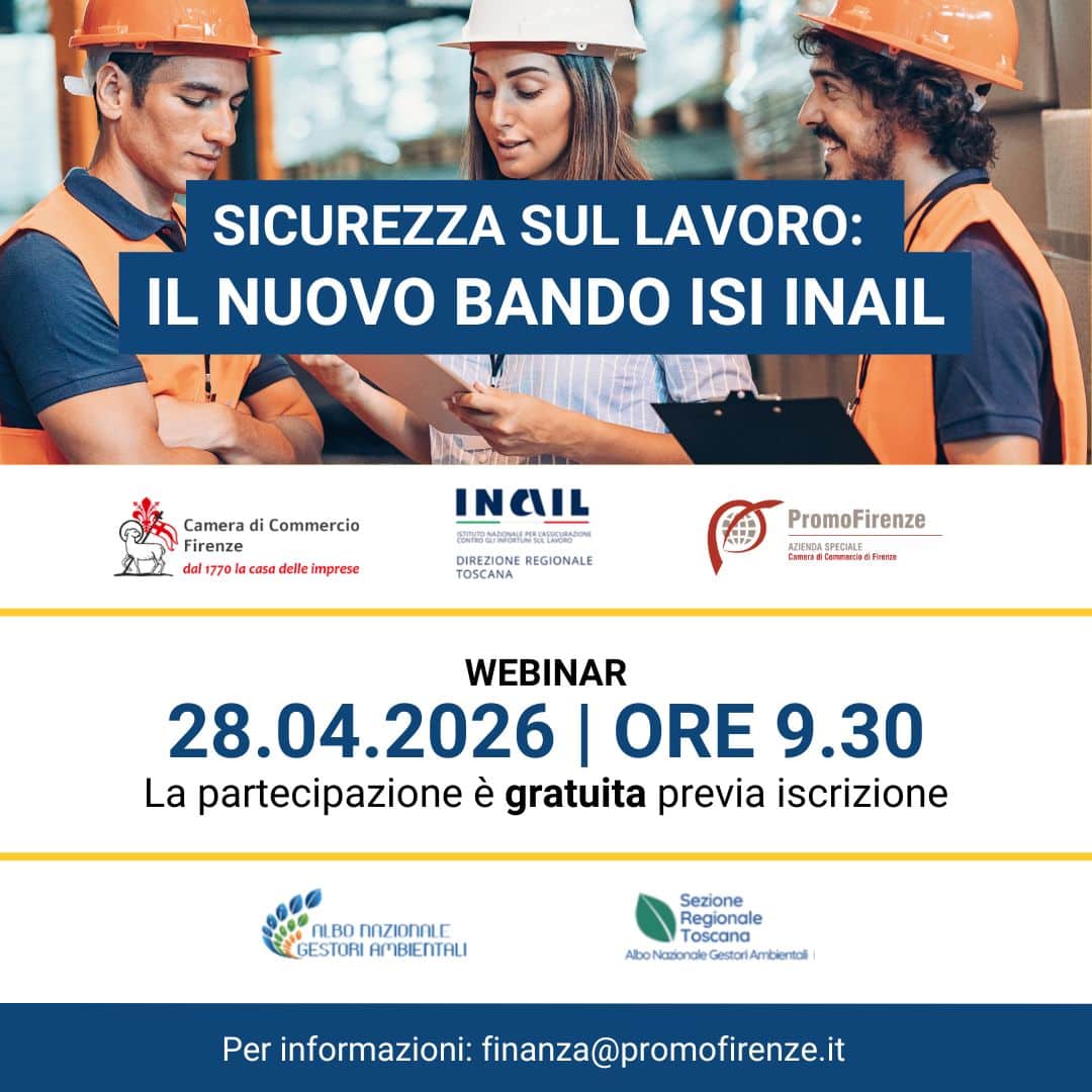 28 Aprile @ 09:30 - 13:00 Webinar: il nuovo bando INAIL ISI 2025 Webinar online La Camera di Commercio di Firenze, PromoFirenze, INAIL Toscana e la Sezione Toscana dell’Albo Gestori Ambientali, organizzano un webinar di approfondimento sull’Avviso Pubblico INAIL ISI 2025, che prevede contributi a fondo perduto per le imprese che investono nel miglioramento della sicurezza sul lavoro.L’incontro illustrerà gli aspetti amministrativi e tecnici utili alla presentazione dei progetti. Al termine degli interventi, i professionisti di INAIL risponderanno ai quesiti dei partecipanti.